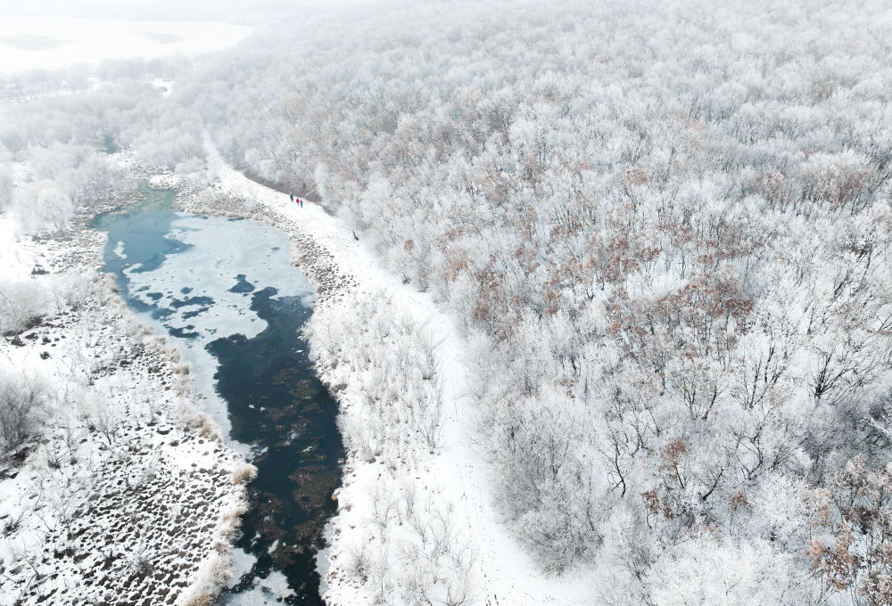 這是11月14日在莫力達(dá)瓦達(dá)斡爾族自治旗拍攝的雪后霧凇景觀(無人機(jī)照片)。新華社記者 連振 攝