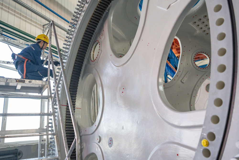 工人在位于黑龍江省齊齊哈爾市的中國(guó)一重集團(tuán)有限公司風(fēng)電設(shè)備裝配車間加工風(fēng)電輪轂(4月28日攝)。新華社記者 謝劍飛 攝