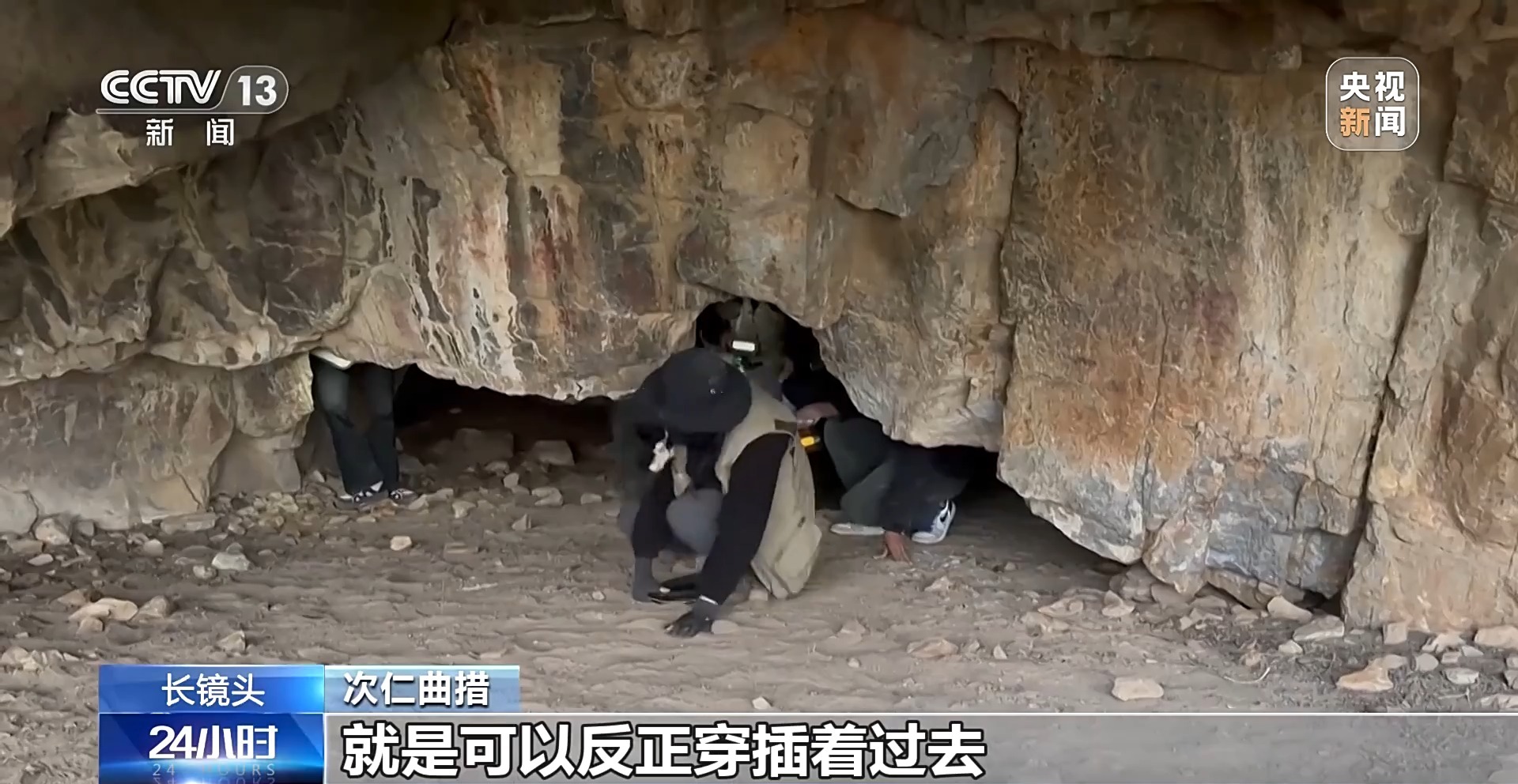 次仁曲措:當?shù)氐南驅дf洞里面還有幾個巖畫,我們就趴著進去了。洞里面還有幾個洞口,可以穿插著過去,感覺像拆盲盒一樣,非常好奇,想迫不及待地知道洞口有哪個巖畫,這些人像在跳舞或者在舉行某種儀式。