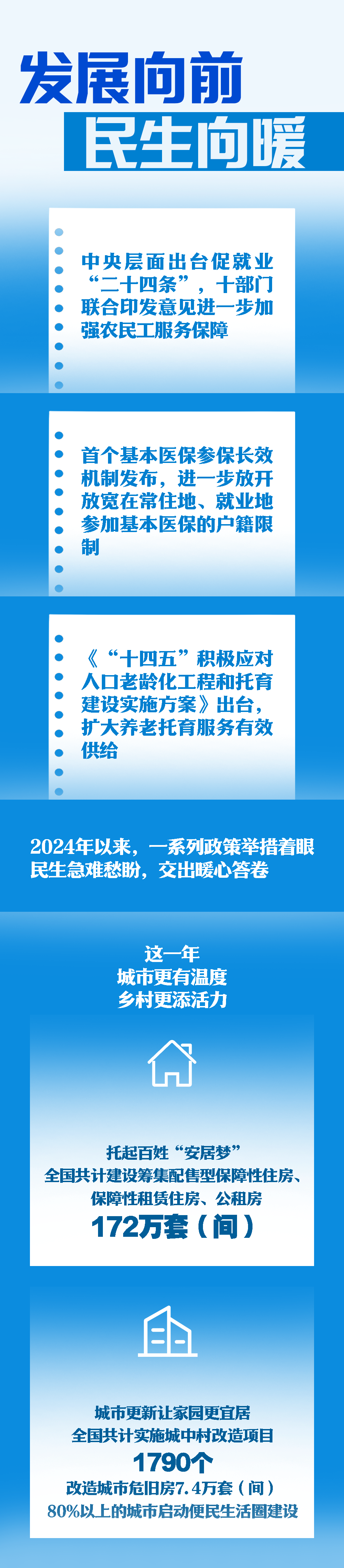 2024年以來(lái),從中央層面出臺(tái)促就業(yè)“二十四條”,到首個(gè)基本醫(yī)保參保長(zhǎng)效機(jī)制發(fā)布,再到聚焦“一老一小”領(lǐng)域擴(kuò)大養(yǎng)老托育服務(wù)有效供給,一系列政策舉措著眼民生急難愁盼,書寫暖心答卷。