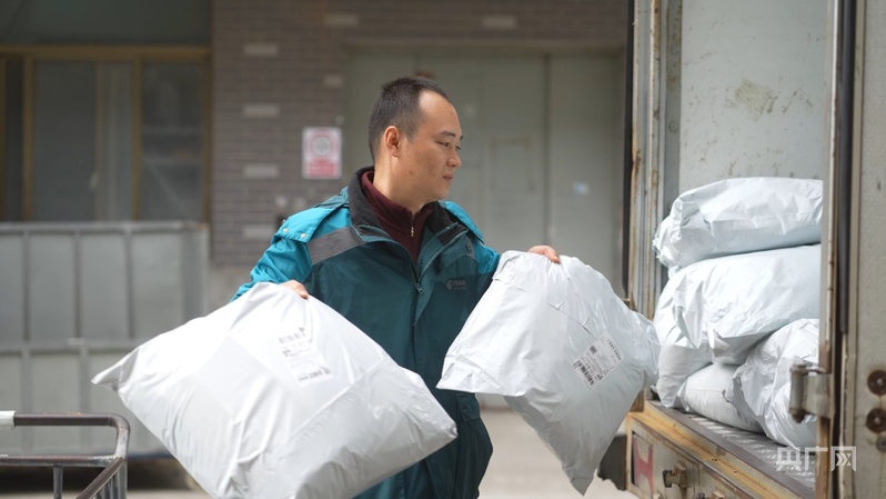 于雷正在企業(yè)廠區(qū)收取快遞件(央廣網記者 楊夢奎 攝)