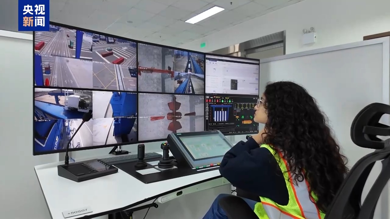 在遠程操作區(qū),我們看到,通過電腦控制系統(tǒng)即可實現(xiàn)港口裝卸的全自動化操作。員工無需再攀上高高的吊機,只需坐在控制臺前,通過多角度實時監(jiān)控屏和搖桿手柄,便能精確完成數(shù)百噸甚至上千噸集裝箱的裝卸任務(wù)。