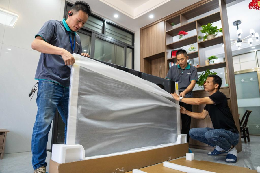 2024年9月24日,在汨羅市屈子祠鎮(zhèn)雙楚村,彭坤(右一)在家中和安裝工人一起打開新電視機(jī)的包裝。新華社記者 陳思汗 攝