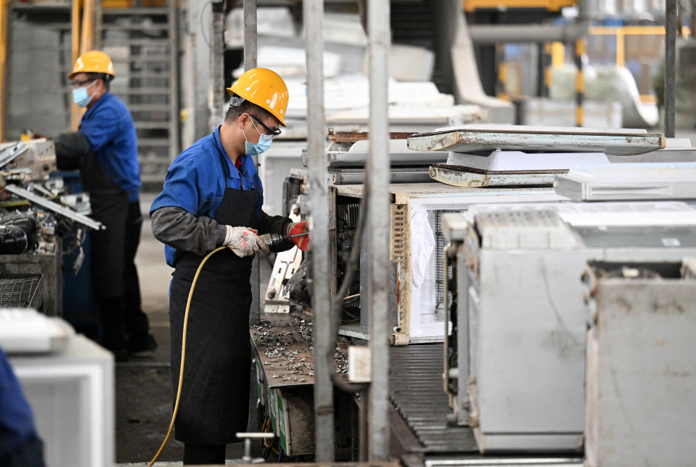 天津一家家電拆解企業(yè)的工作人員在冰箱拆解線拆解廢舊冰箱。新華社記者趙子碩 攝