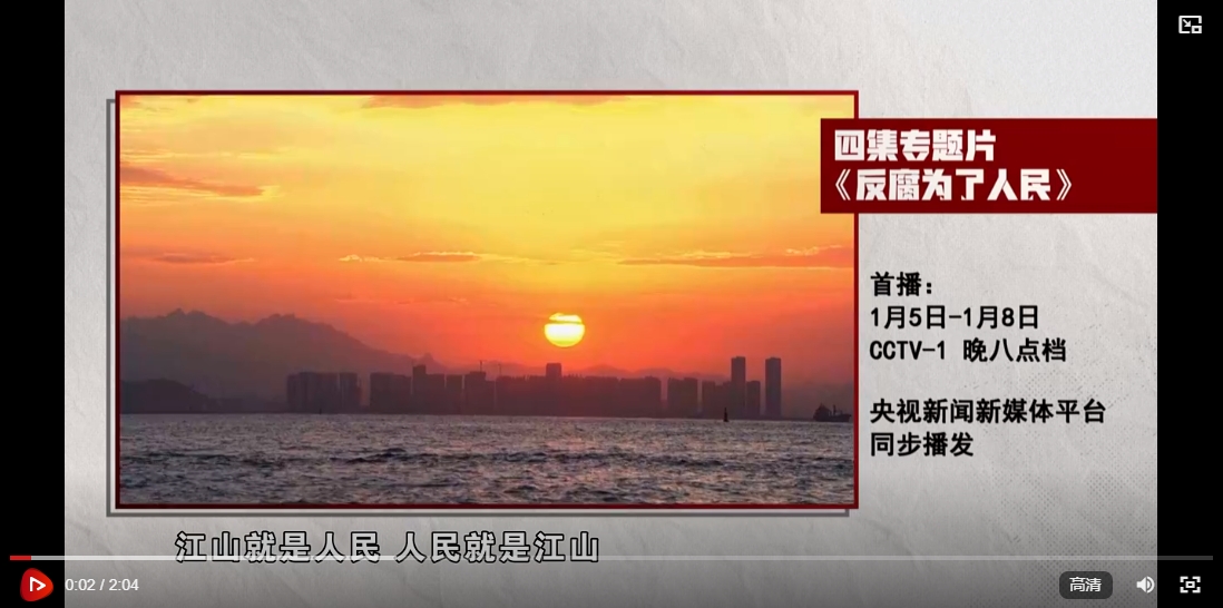 由中央紀(jì)委國家監(jiān)委宣傳部與中央廣播電視總臺聯(lián)合攝制的四集電視專題片《反腐 為了人民》,將于1月5日至8日在中央廣播電視總臺央視綜合頻道晚8點檔播出。