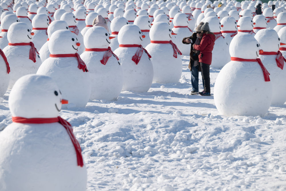 1月3日,在哈爾濱太陽島雪博會園區(qū)入口,游客經(jīng)過“雪人儀仗隊”(無人機照片)。