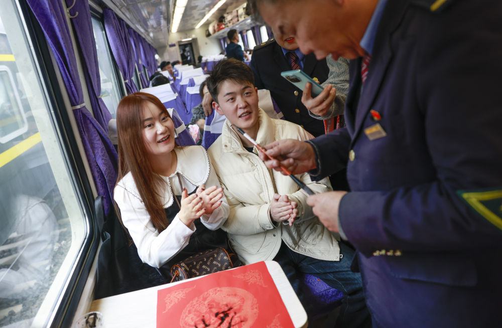 為了讓人們“滿載而歸”,列車員熱情組織旅客寫“?!弊郑€送上飽含心意的春聯(lián)、列車紀念徽章等禮物。