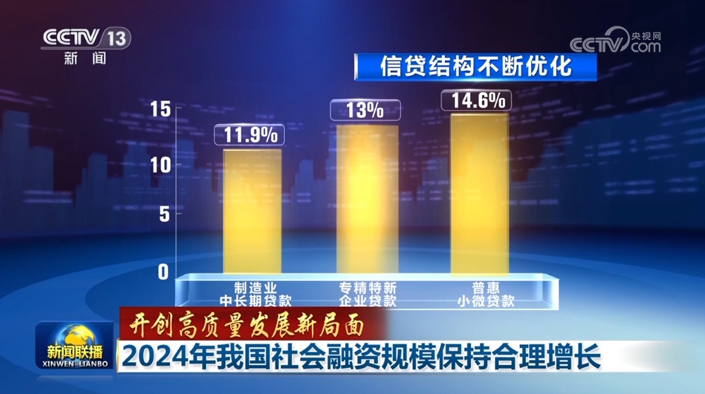 中國人民銀行相關負責人介紹,2024年12月末,社會融資規(guī)模存量為408.34萬億元,其中,對實體經濟發(fā)放的人民幣貸款余額為252.53萬億元,同比增長7.2%。信貸結構不斷優(yōu)化,制造業(yè)中長期貸款、專精特新企業(yè)貸款、普惠小微貸款增長較快,繼續(xù)高于同期全部貸款增速。