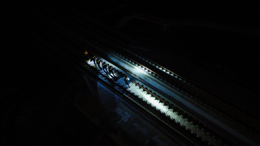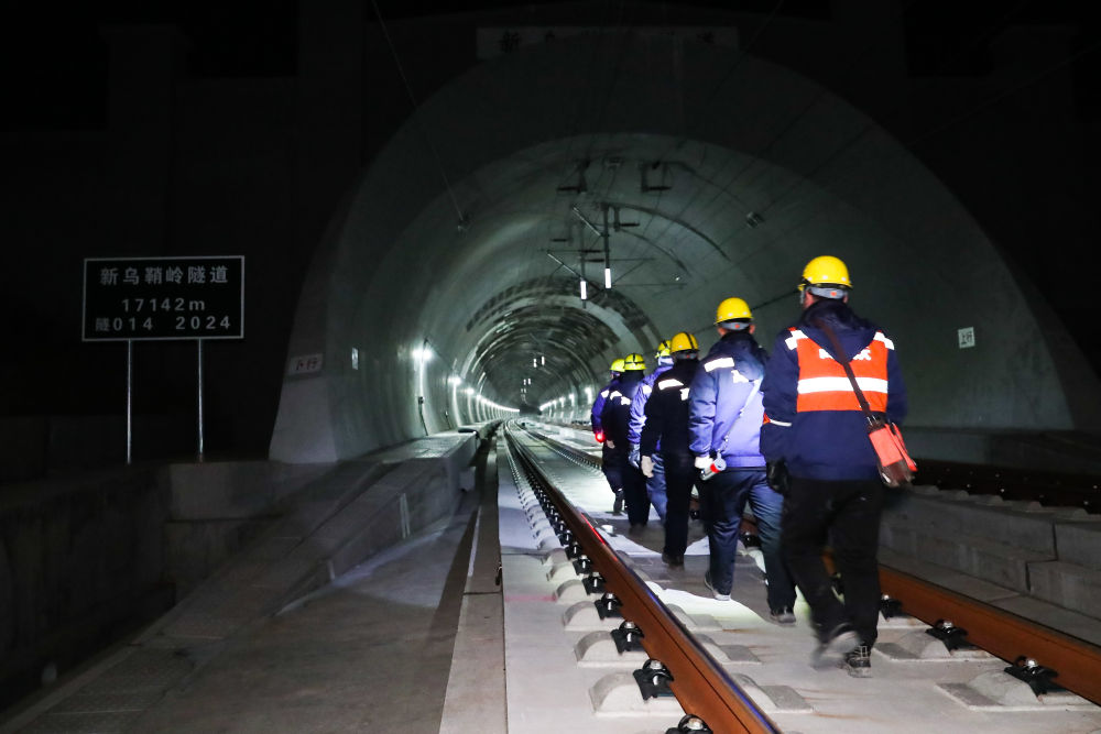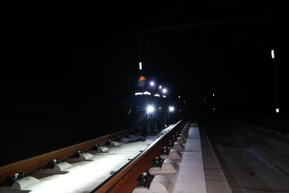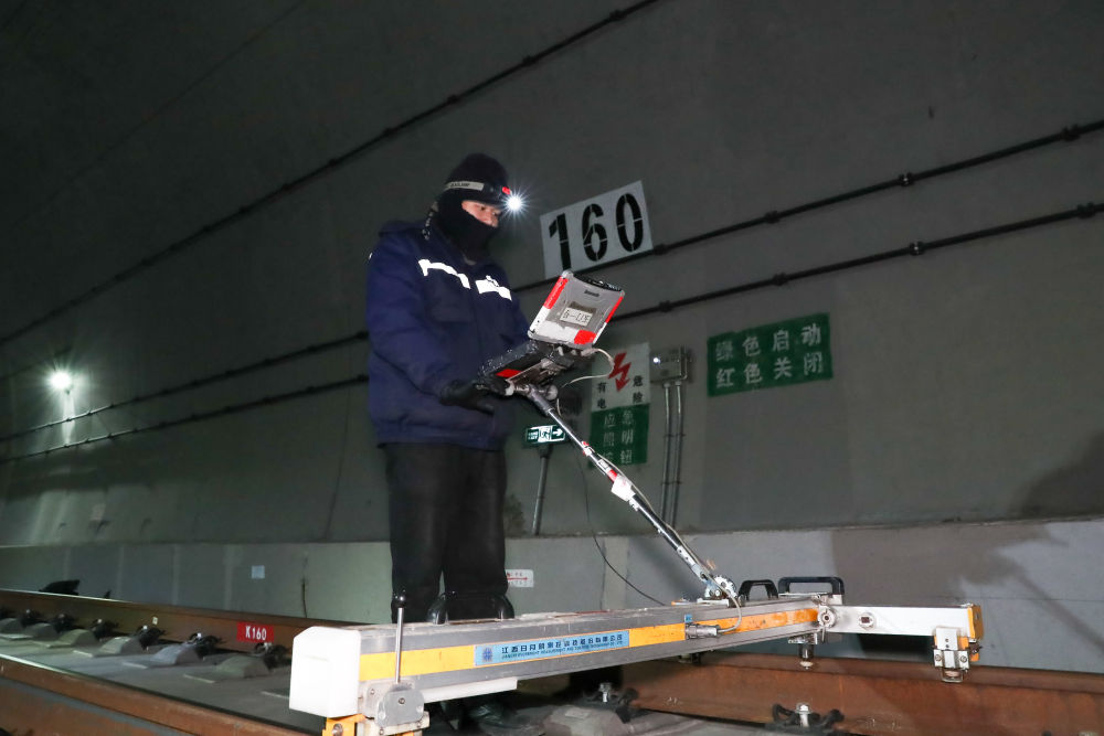 1月14日凌晨,在新烏鞘嶺隧道內(nèi),線(xiàn)路工使用鐵路軌道檢查儀檢查線(xiàn)路幾何尺寸。新華社記者 郎兵兵 攝
