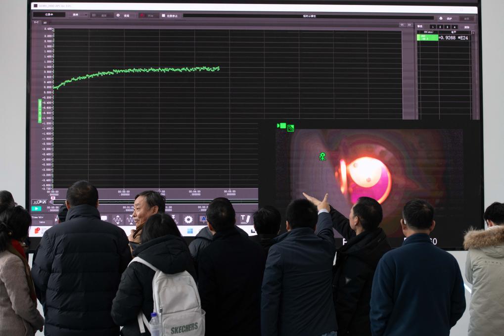 2025年1月14日,在位于安徽省合肥市的聚變堆主機(jī)關(guān)鍵系統(tǒng)綜合研究設(shè)施(CRAFT)園區(qū)內(nèi),科研人員及專(zhuān)家通過(guò)大屏幕了解強(qiáng)流直線(xiàn)等離子體裝置“赤霄”的運(yùn)行狀態(tài)。新華社記者 張端 攝