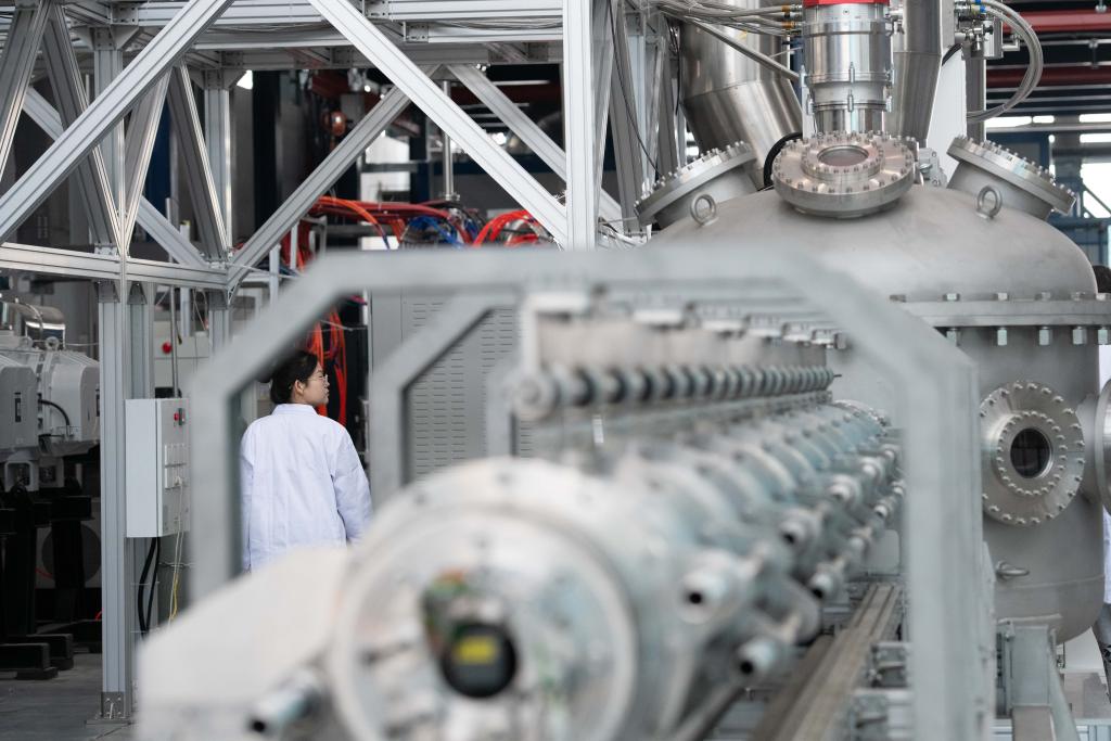 2025年1月14日,科研人員在巡看強(qiáng)流直線(xiàn)等離子體裝置“赤霄”的運(yùn)行狀態(tài)。新華社記者 張端 攝