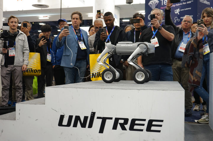 2025年1月8日,在2025年美國(guó)拉斯維加斯消費(fèi)電子展(CES)上,人們?cè)谥袊?guó)企業(yè)宇樹(shù)科技的展區(qū)觀看機(jī)器狗展示。新華社發(fā)(曾慧攝)