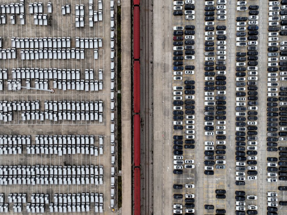 這是在中鐵聯(lián)集武漢中心站拍攝的整裝待發(fā)的汽車(2024年11月16日攝,無(wú)人機(jī)照片)。新華社記者 邢廣利 攝