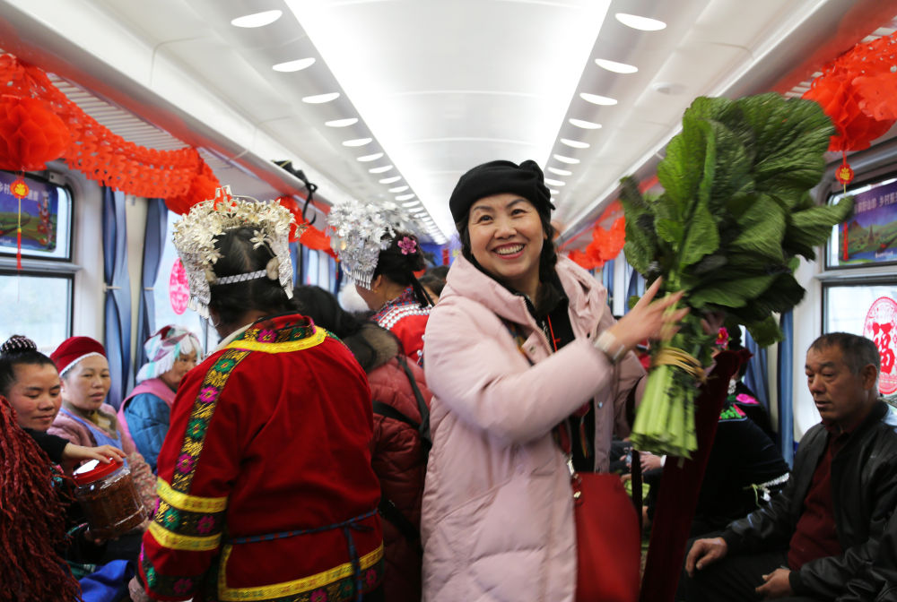 1月18日,沿途村民在5640次列車“鄉(xiāng)村集市”車廂售賣農(nóng)產(chǎn)品。新華社記者 楊文斌 攝
