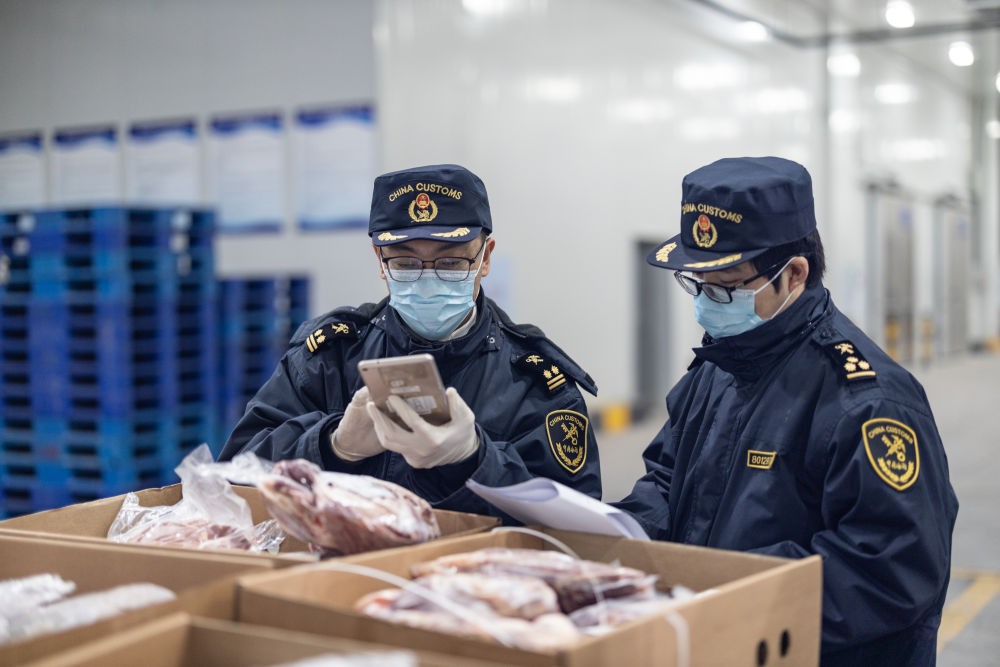 打開米白色的冷凍集裝箱,重慶海關(guān)所屬渝州海關(guān)監(jiān)管科副科長劉議凡與同事正仔細查驗一批來自歐洲的肉類。不久后它們將被送至川渝地區(qū)各大商超、火鍋店。