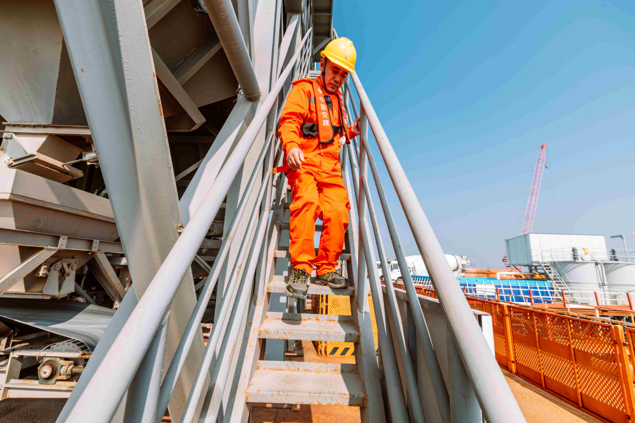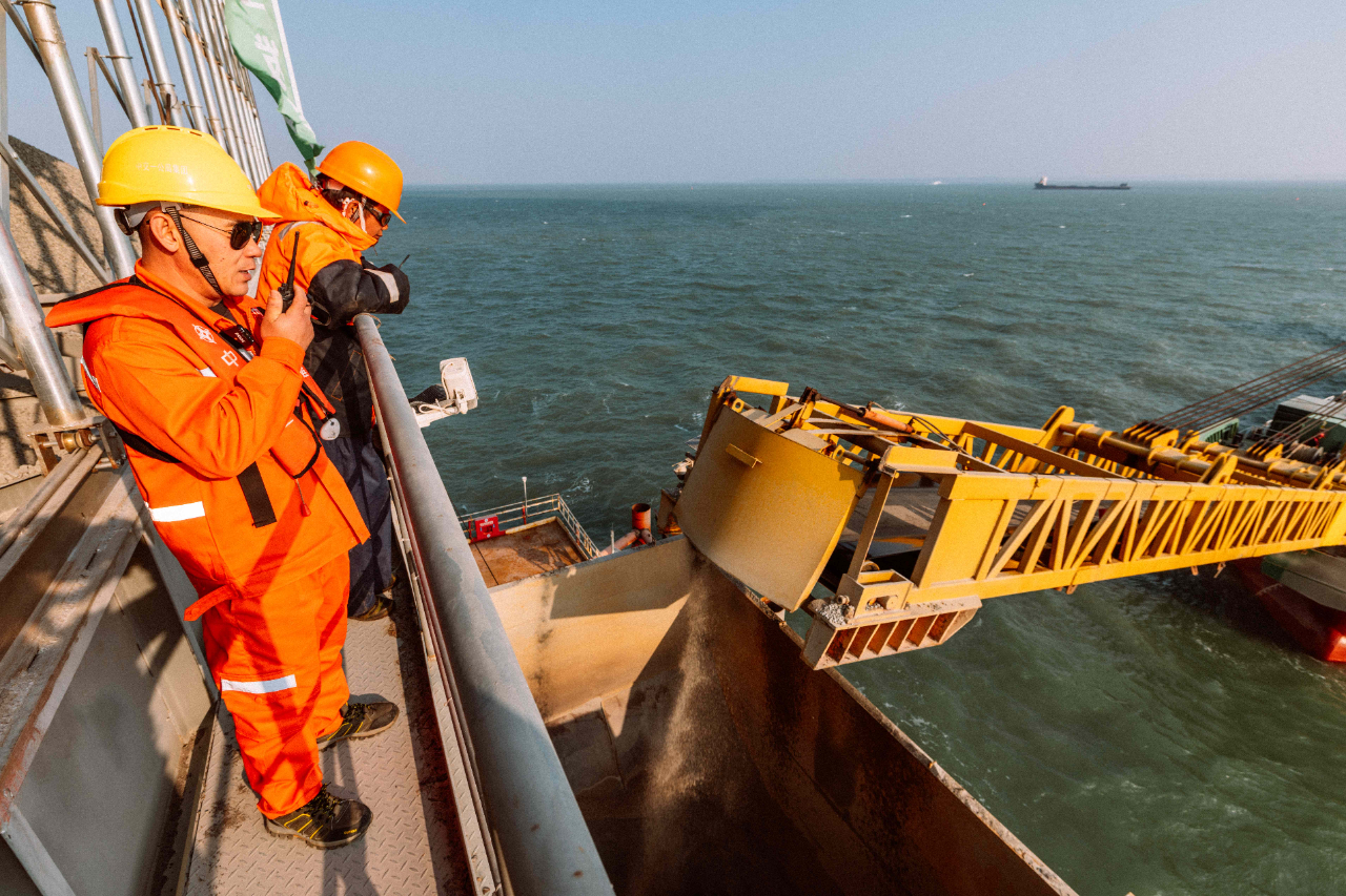 1月17日,夕陽(yáng)下的廈門(mén)劉五店港區(qū),北風(fēng)勁吹。在距離中交一公局集團(tuán)廈金大橋(廈門(mén)段)項(xiàng)目海上平臺(tái)混凝土操作員梁芝敬站立位置不到30米的洋面上,一艘船身印有“帆順168”字樣的補(bǔ)料船,裝載著4000多噸砂石緩緩抵近。船頭前方延伸出一條25米長(zhǎng)的傳送皮帶,將船上的砂料源源不斷地送抵老梁眼前的鋼制固料斗內(nèi)。當(dāng)天他們要趁著海水退潮帶來(lái)的作業(yè)窗口,為站里補(bǔ)上700噸機(jī)制砂和900噸粒徑10到20毫米的小石子,以確?;炷琳旧a(chǎn)不停機(jī)。