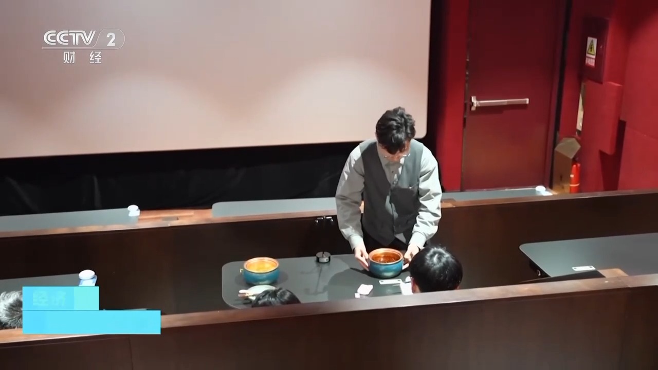 在江蘇蘇州的這家影院,不僅把餐桌、點(diǎn)餐二維碼引入了影廳,還創(chuàng)新改造了一間專門的火鍋影廳。記者采訪時(shí)正值晚飯時(shí)間,觀眾取票入座,掃碼點(diǎn)餐,就著熱氣騰騰的火鍋看電影,別有一番風(fēng)味。