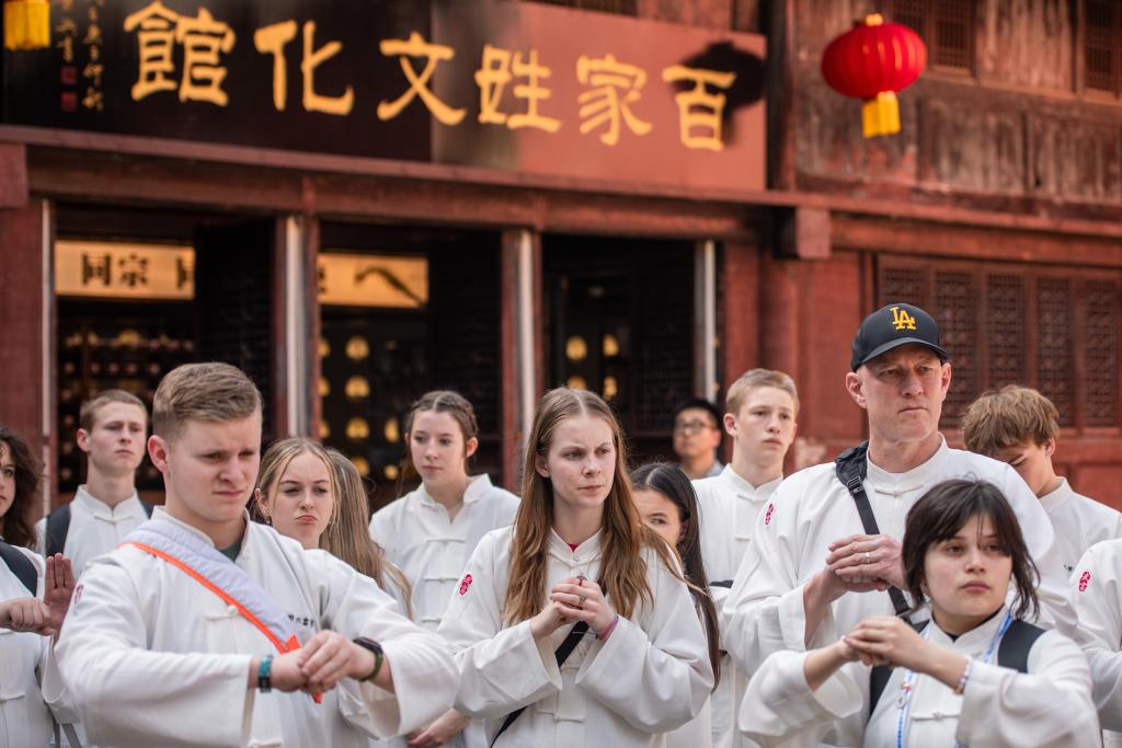 2024年3月22日,美國華盛頓州中學(xué)生代表團成員在武當山學(xué)習(xí)如何抱拳。新華社記者 伍志尊 攝