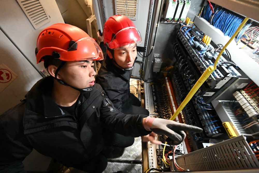 黃志明(右)和鄭桂雄在風(fēng)機機艙內(nèi)開展故障處理。新華社記者 林善傳 攝