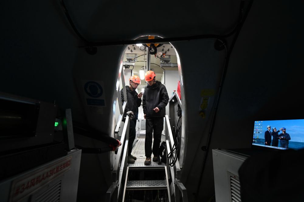記者爬上海上風(fēng)電平臺基座。新華社記者 林善傳 攝
