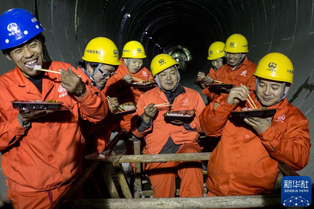2014年1月30日農(nóng)歷除夕,為確保工程按計(jì)劃順利完工,中鐵隧道集團(tuán)承建的北京市南水北調(diào)配套工程?hào)|干渠第五標(biāo)段仍在施工,工人們?cè)谧约旱墓ぷ鲘徫簧铣粤祟D特殊的年夜飯。新華社記者 張宇 攝