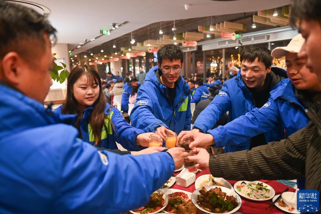 2025年1月22日,快遞員和家屬在“年夜飯”活動(dòng)上碰杯。當(dāng)日,200余名大部分來自外地的快遞員及家屬受邀參加一場(chǎng)“年夜飯”活動(dòng),提前在異鄉(xiāng)感受春節(jié)團(tuán)聚的溫暖。 新華社記者 黃宗治 攝