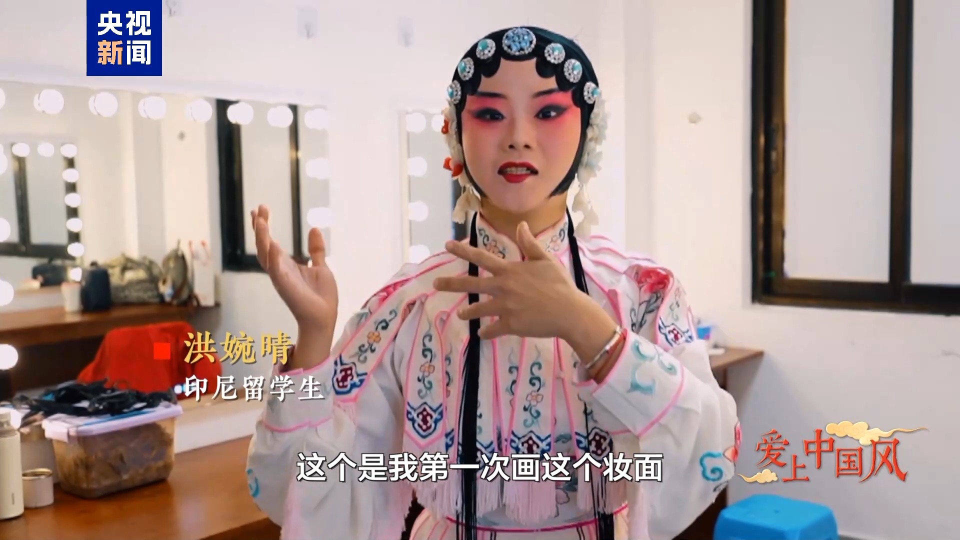 印尼留學(xué)生 洪婉晴:大家好,我是瑪麗莎。我的中文名叫洪婉晴,我來自印尼蘇門答臘島。今年是我到中國(guó)的第8個(gè)年頭了。喜歡川劇已經(jīng)有至少5年了吧,但像現(xiàn)在有化妝師給我做妝造,可以畫上旦角的妝面,穿上川劇戲服,來演一場(chǎng)戲真的是我人生中的第一次。