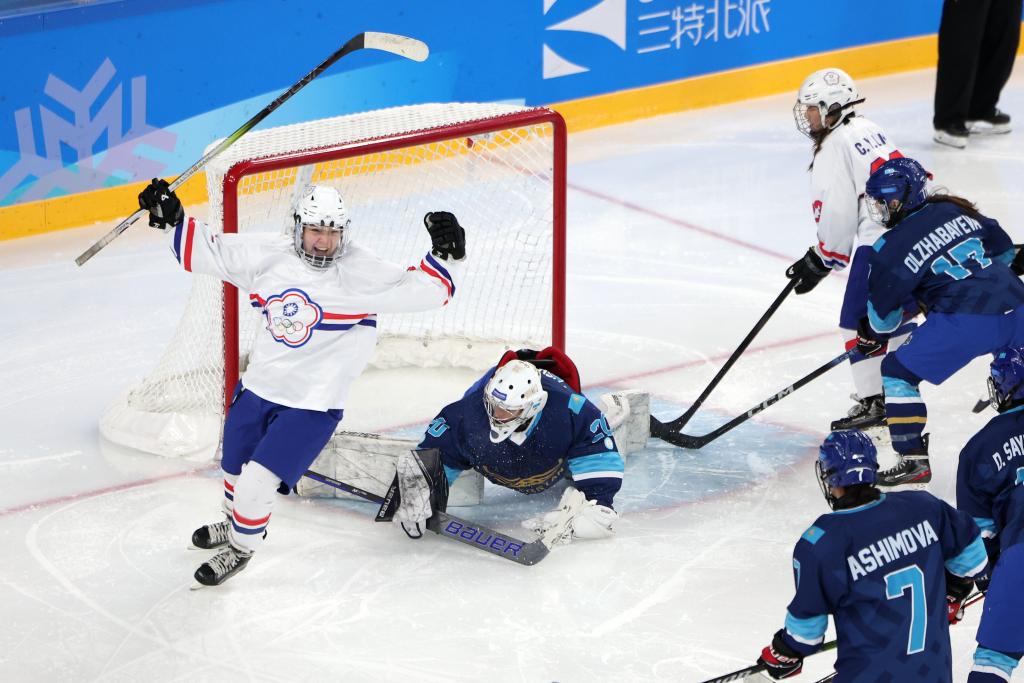 2月6日,在哈爾濱體育學院舉行的2025年第九屆亞冬會女子冰球小組賽B組比賽中,中國臺北隊1:5不敵哈薩克斯坦隊。新華社記者 孫非 攝