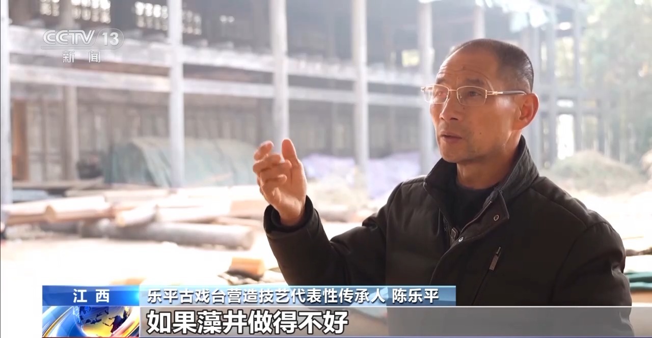 樂平古戲臺(tái)營(yíng)造技藝非遺傳承人 陳樂平:古代人做螺旋頂,做得越好的,回音就響亮。如果藻井做得不好,古代沒有擴(kuò)音器,做得不好回音就回不出來。