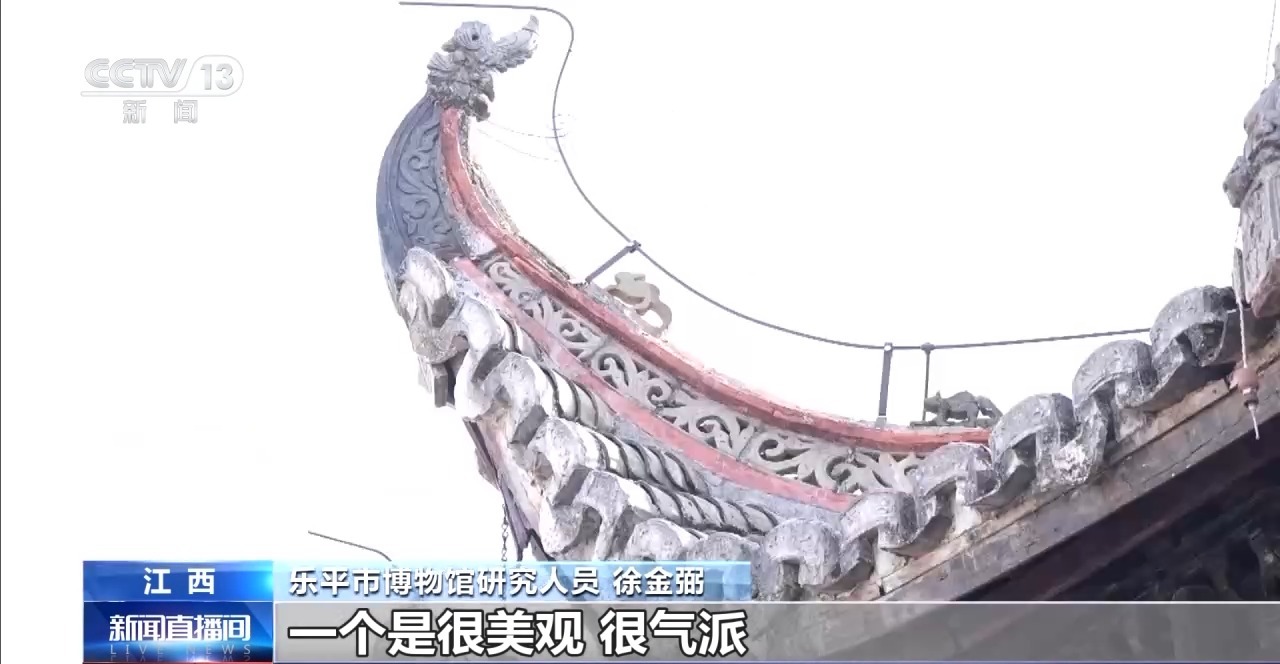 樂平市博物館研究人員 徐金弼:寶頂在古建筑里面一般都有,一個(gè)是很美觀、很氣派。它可以避雷,起保護(hù)古建筑作用。戲臺(tái)翹角,它有兩個(gè)功能,一個(gè)防水,一個(gè)采光,氣勢(shì)恢宏。