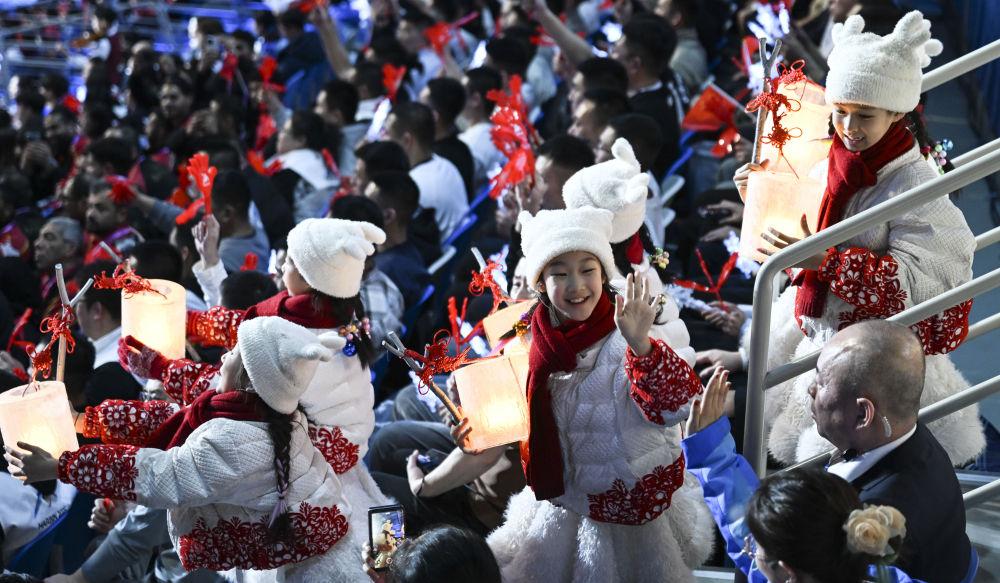 當(dāng)晚,在開幕式分會(huì)場(chǎng)冰雪大世界,手提冰燈的孩子們來(lái)到占地百萬(wàn)平方米的園區(qū),與冠軍火炬手一同滑行,見(jiàn)證主火炬點(diǎn)燃。