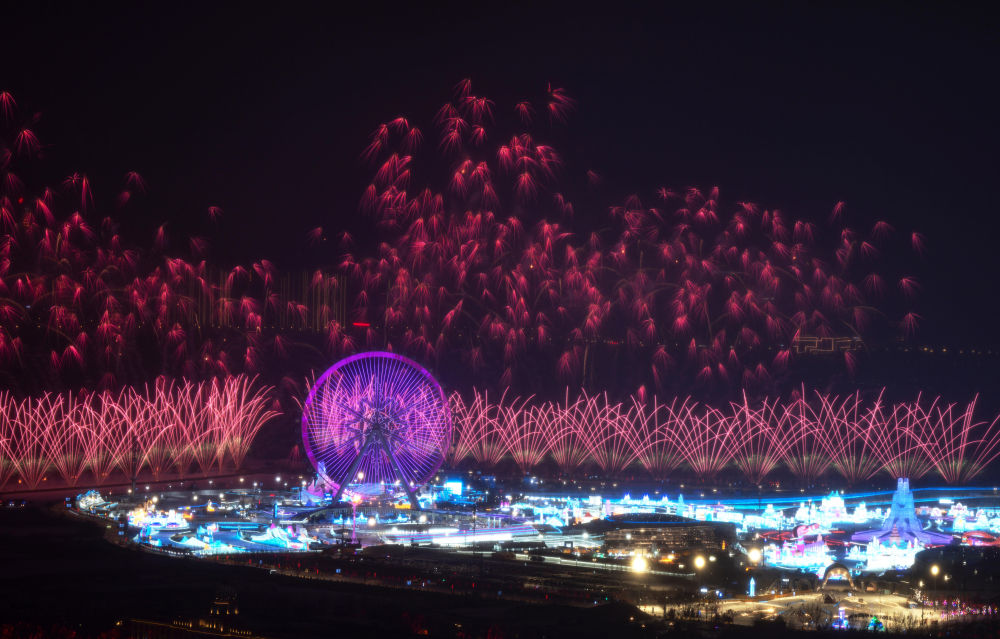 2025年2月7日,焰火在開幕式分會場上空綻放。