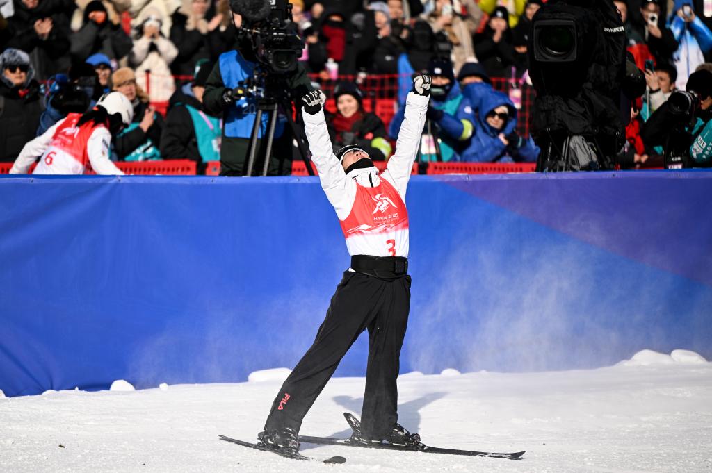 2月9日,徐夢桃在第九屆亞冬會自由式滑雪女子個(gè)人空中技巧決賽后慶祝。新華社記者 夏一方 攝