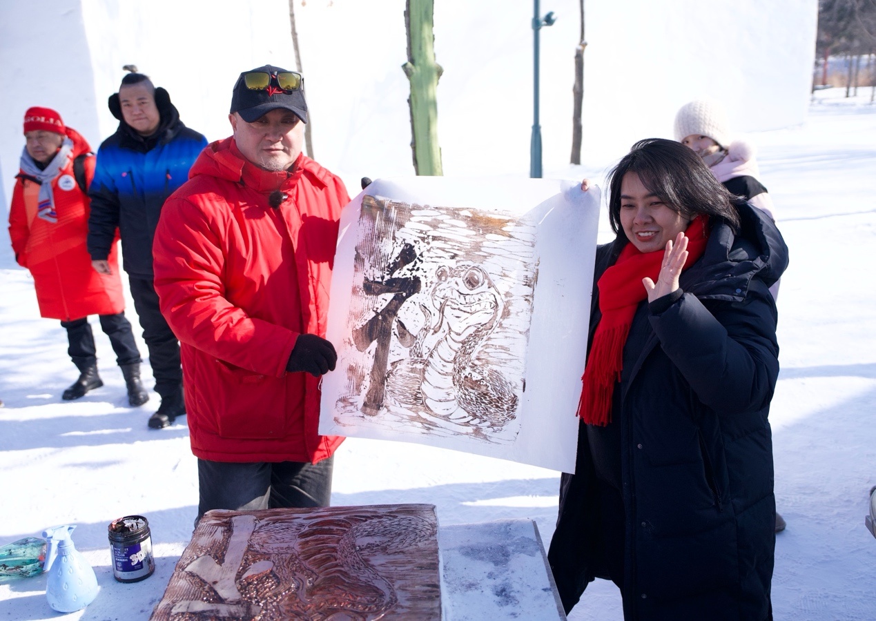 泰國駐華大使館二等秘書王安安在黑龍江省藝術(shù)研究院冰版畫研究院副院長盛琰的指導(dǎo)下,制作出冰版畫《畫蛇添?!?,用蛇的形狀和漢字的偏旁部首組合雕刻出漢字“?!辈⑼赜〕鰜?,寄托對(duì)中國農(nóng)歷蛇年的祝福。