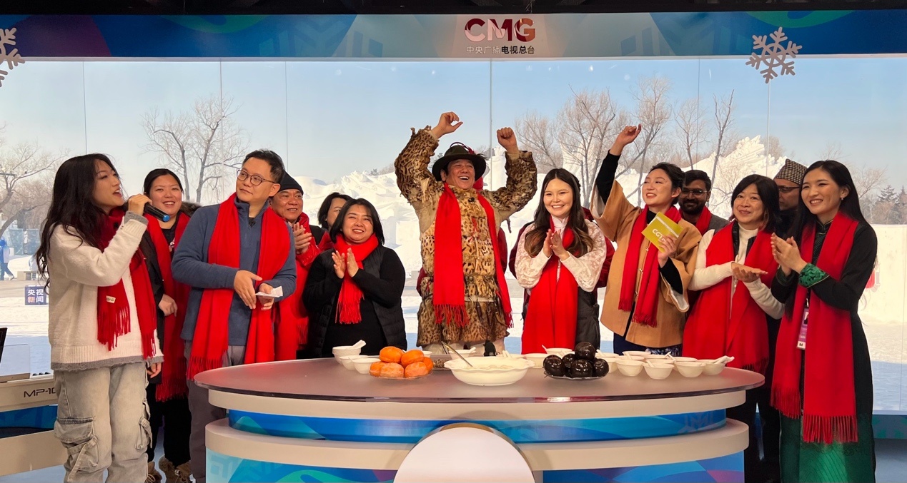 參加“當(dāng)亞冬會(huì)遇上‘非遺年’”人文交流活動(dòng)的中外嘉賓在哈爾濱太陽島雪博會(huì)CMG演播室同慶新春