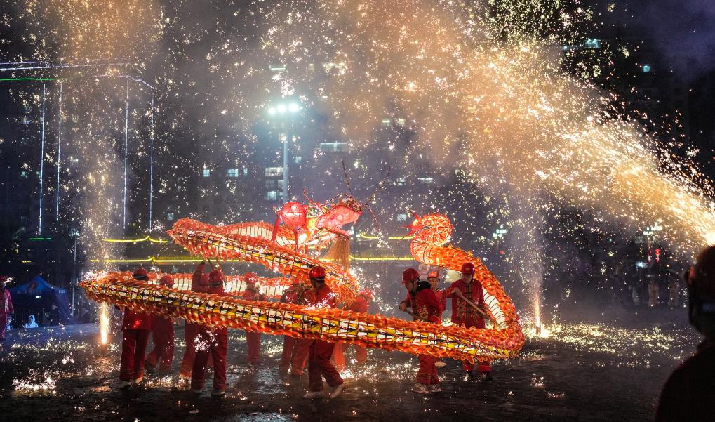 2月11日晚,人們在臺江縣參加“舞龍噓花”活動。新華社記者 陶亮 攝