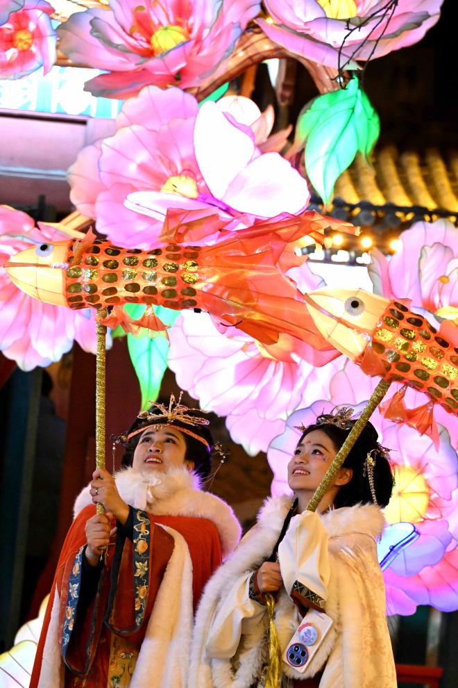 2月8日晚,身著傳統(tǒng)服飾的游人在河北省石家莊市正定榮國府影視基地內(nèi)游園賞花燈。新華社發(fā)(陳其保攝)