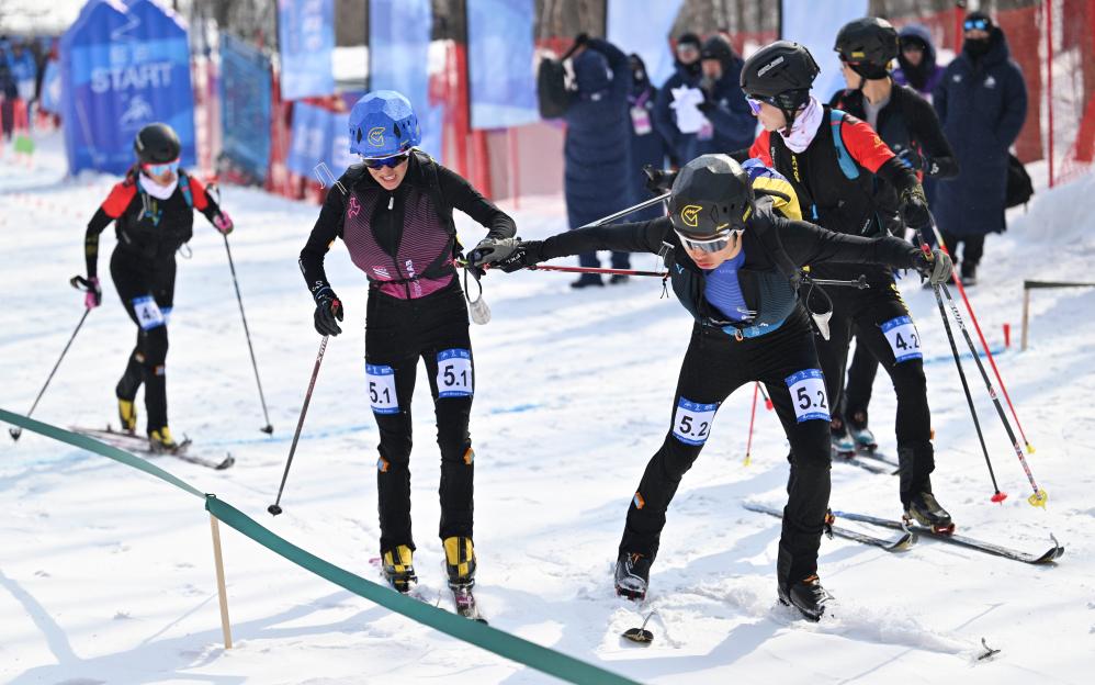 2月12日,次旦玉珍(前左)/布魯爾在比賽中交接棒。當(dāng)日,第九屆亞冬會(huì)滑雪登山混合接力決賽在亞布力舉行。中國(guó)組合次旦玉珍/布魯爾、于婧萱/畢禹新、索朗曲珍/劉建賓分別獲得冠、亞、季軍。新華社記者 謝劍飛 攝