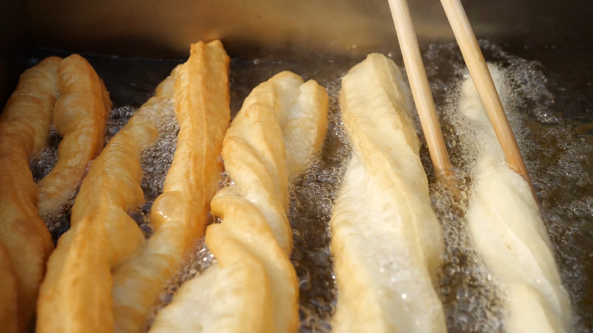 史梅菊賣早餐賣了二三十年,今年她和小叔子江新軍代表江莊村參賽。為防止面團(tuán)粘連,史梅菊用搟面杖在油鍋里沾點(diǎn)油后,再把面團(tuán)搟成長(zhǎng)面餅狀。用刀快速切條,兩個(gè)面餅條疊在一起,史梅菊再用手摁壓幾下,給油條在鍋里留足發(fā)酵空間,以此保持油條的蓬松感。江新軍負(fù)責(zé)不停地翻轉(zhuǎn)鍋里的油條。