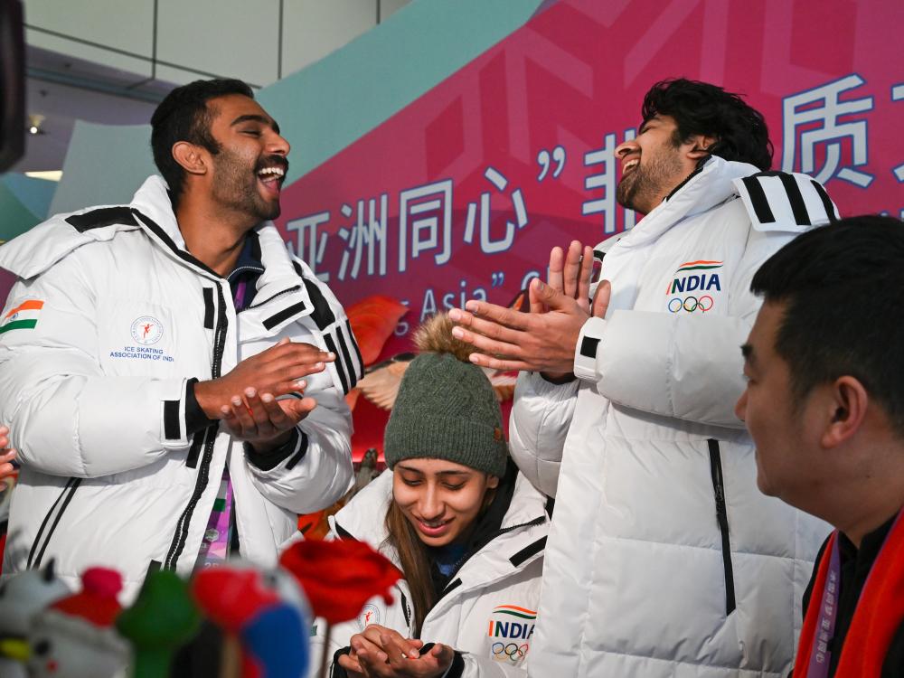 ↑印度代表團速度滑冰運動員在體驗面塑制作。新華社記者 王曦 攝