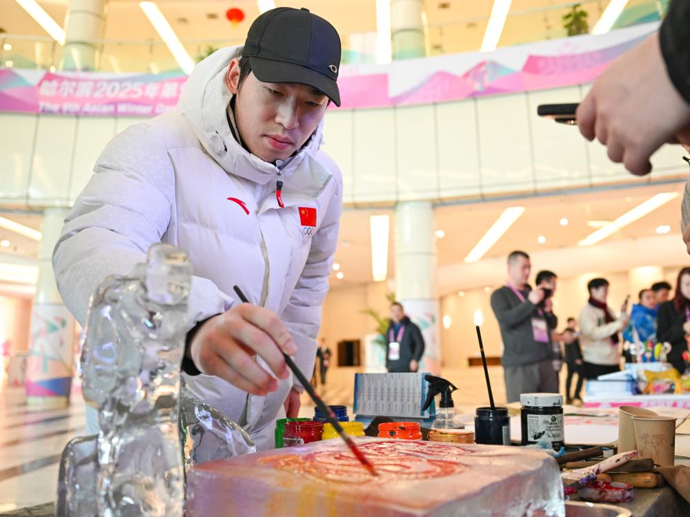 ↑在第九屆亞冬會運動員村,中國代表團的冰球運動員張澤森在體驗拓彩冰雪畫。新華社記者 王曦 攝
