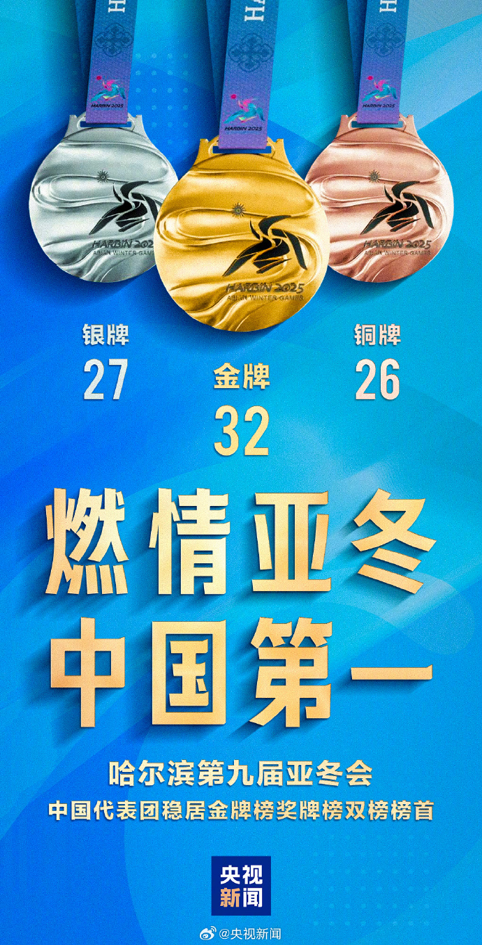 中國體育代表團收獲32金、27銀、26銅共計85枚獎牌,位列本屆亞冬會金牌榜和獎牌榜首位,創(chuàng)造亞冬會歷史參賽最好成績。