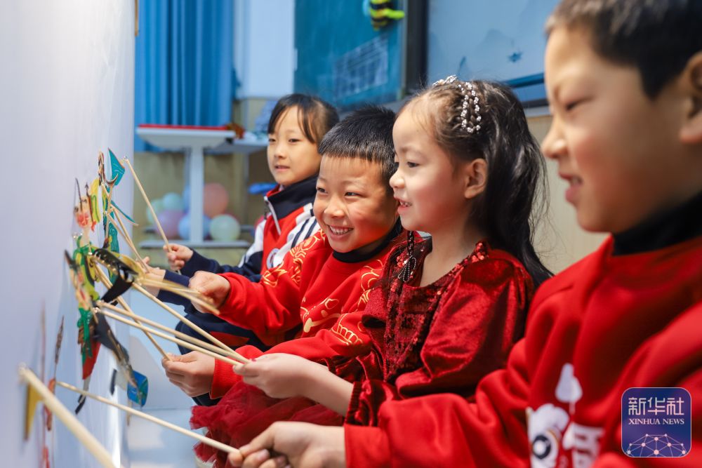 2月14日,學(xué)生在山東省青島崇禮小學(xué)體驗皮影戲表演。新華社發(fā)(張鷹攝)