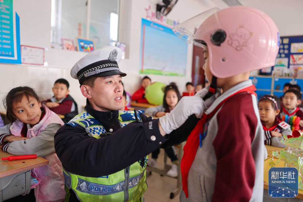 2月14日,在山東省榮成市府新小學(xué)教室內(nèi),交警為學(xué)生講解安全頭盔的正確佩戴方法。新華社發(fā)(李信君攝)