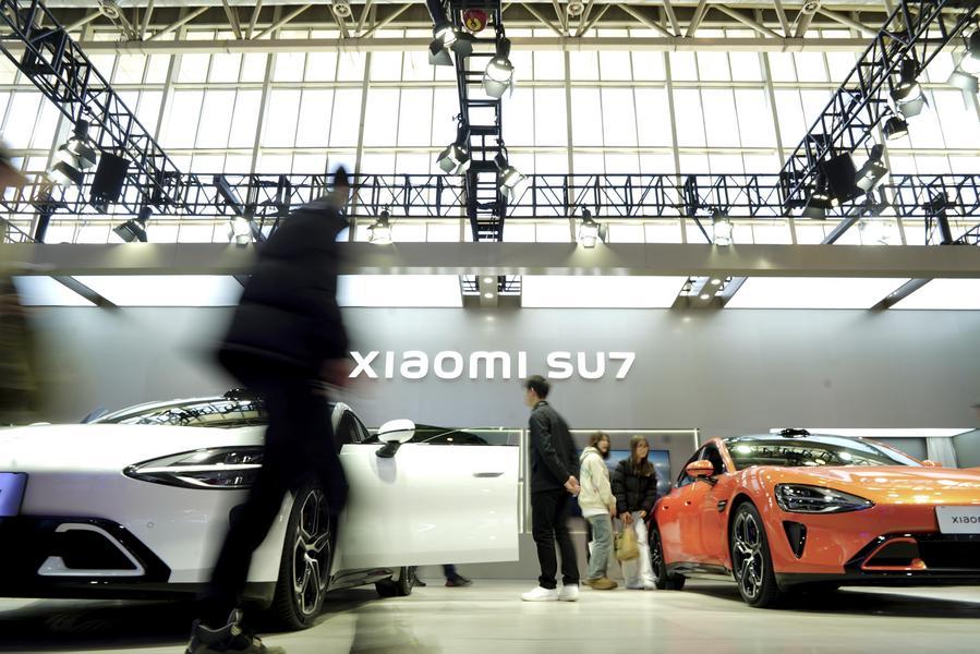 2024年11月28日,人們?cè)诘诙弥袊?guó)國(guó)際供應(yīng)鏈促進(jìn)博覽會(huì)智能汽車(chē)鏈展區(qū)小米汽車(chē)展臺(tái)參觀。新華社發(fā)(那宇奇攝)