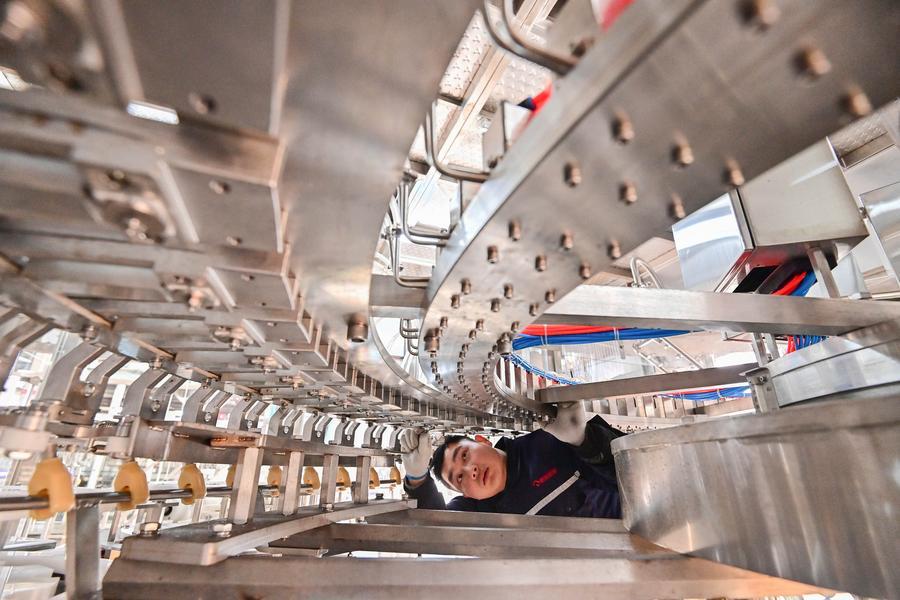 2月14日,在山東省青州經(jīng)濟(jì)開(kāi)發(fā)區(qū)一家灌裝設(shè)備制造企業(yè),工人在車(chē)間內(nèi)裝配作業(yè)。新華社發(fā)(王繼林?jǐn)z)