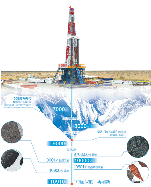 回望來路,20世紀(jì)70年代,我國第一口井深超過7000米的鉆井完鉆。從7000米到突破8000米,歷經(jīng)29年;從8000米到邁入9000米,歷經(jīng)15年;從9000米到?jīng)_破10000米大關(guān),僅用3年。