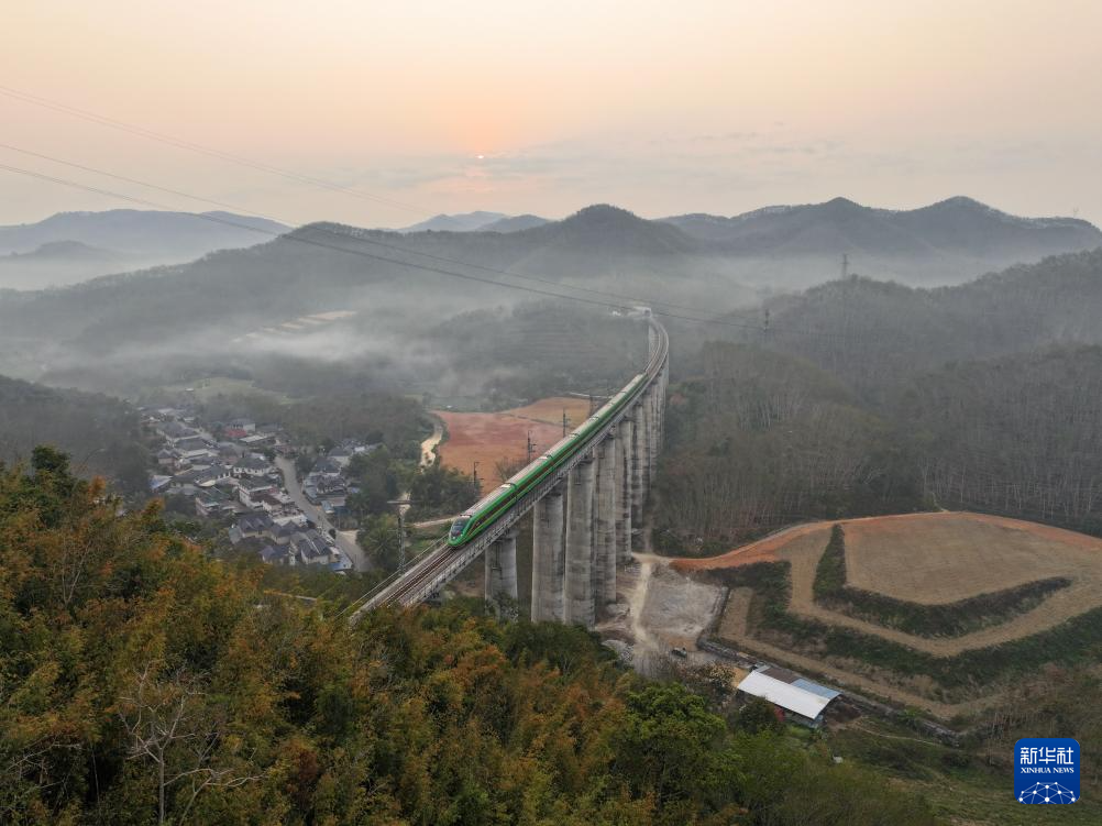 圖為2月22日,動(dòng)車(chē)組列車(chē)行駛在云南省景洪市境內(nèi)的中老鐵路上(無(wú)人機(jī)照片)。