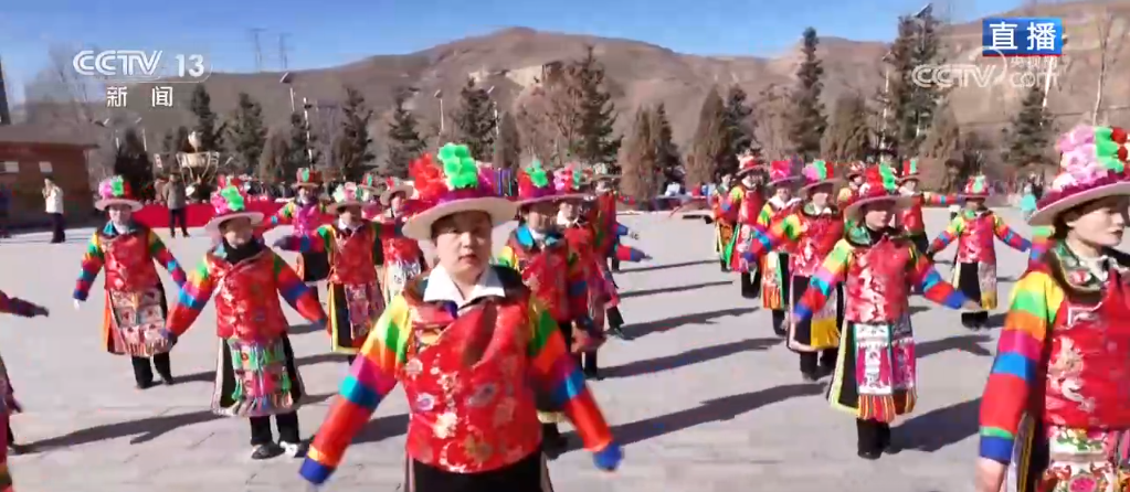 記者來到班彥村的村口廣場看到,三十多位土族姑娘和小伙子們身穿鮮艷的民族服飾,手挽手肩并肩,跳起土族傳統(tǒng)舞蹈——安召舞,為即將到來的互助縣農(nóng)歷“二月二”傳統(tǒng)擂臺廟會暨“非遺宣傳周”展示活動做準(zhǔn)備。歡快的節(jié)奏真的是非常有感染力,每個人身上似乎都洋溢著火一般的熱情。