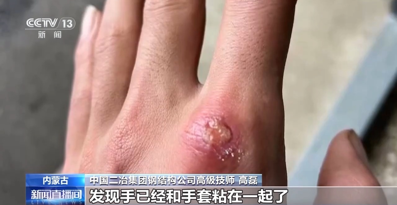 中國二冶集團(tuán)鋼結(jié)構(gòu)公司高級(jí)技師 高磊:如果你中途停止的話,再重新起弧就可能造成焊接缺陷,我就沒有選擇停,我就咬著牙堅(jiān)持把這段焊縫完成,直到焊到最后,等我往下摘我的焊工手套的時(shí)候,發(fā)現(xiàn)手已經(jīng)和手套粘在一起了,燙出特別大一個(gè)水泡。
